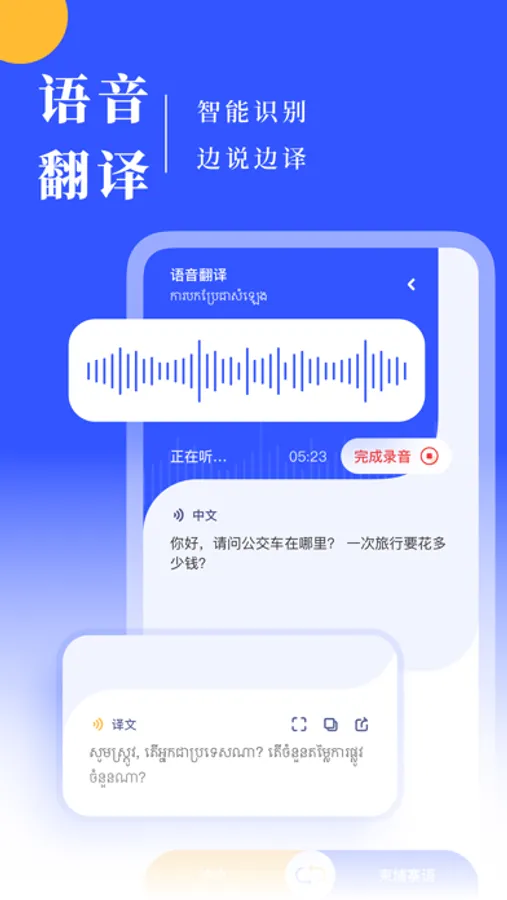 柬埔寨翻译,让你无论在哪个角落,都不必担心语言问题,与外国人无障碍沟通,让你说走就走,快来下载体验吧!