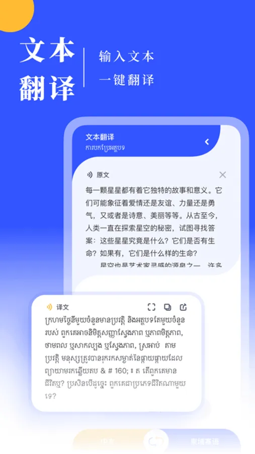 柬埔寨翻译,致力于为用户提供柬埔寨语(旧称高棉语)智能翻译服务,译文自然流畅,大幅提升了翻译质量。能满足你学习、工作、旅游出行等场景需求,走到哪里翻译到哪里。