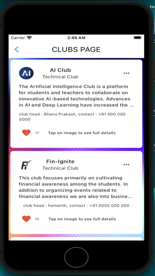 Clubs: The app has information about all the clubs and sports shared by the students, it will also provide their activities, and contact details, making it easier for you to stay informed about what's happening in clubs and sports.