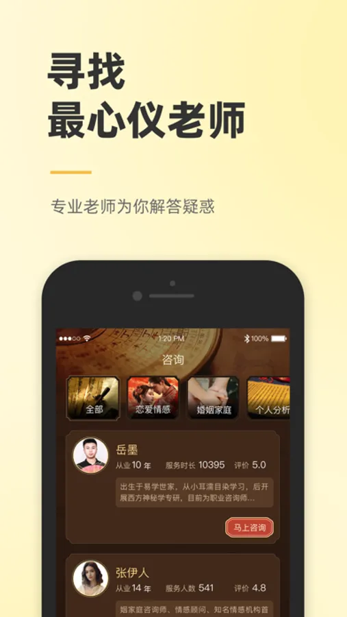 汇集海量情感咨询师、婚姻家庭咨询师等,还有海量的精英倾听者,为您提供恋爱心理、婚姻情感、挽回前任、婚姻修复等个性化的在线情感咨询服务,帮您重获幸福。