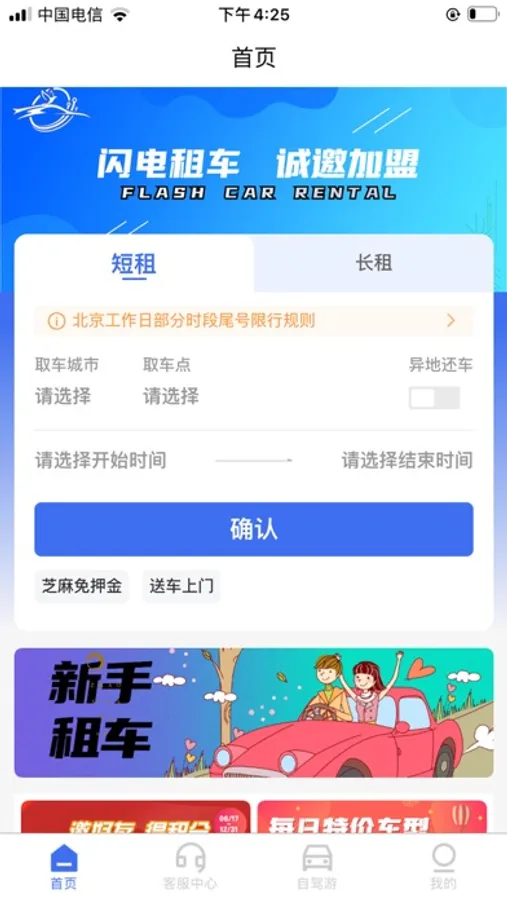 麻雀闪电租车APP,支持用户使用芝麻信用免押租车的一款APP,主要服务于京津冀地区,全国连锁商家136家,为平台用户提供各种车型的租车APP。