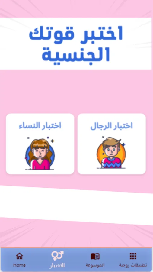 عند فتح التطبيق، يُرحب المستخدم بتصميم جذاب وملهم يعزز الفضول للاستكشاف. يتمكن المستخدمون من الاختيار بين قسمي الاختبار، حيث يمكنهم اختيار الجنسية المناسبة لهم للبدء في التحدي. يتيح التطبيق مجموعة واسعة من الأسئلة والتحديات المتنوعة التي تتناول مختلف جوانب القوة الجنسية والأداء الجنسي.