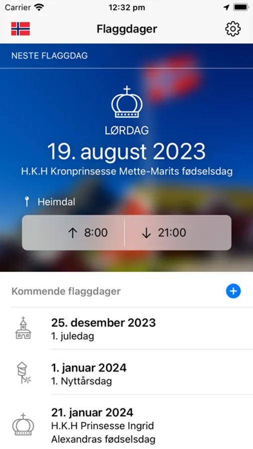 Har du flaggstang, balkongflagg, eller kanskje bare et bordflagg? Lurer du på når du skal flagge? Flaggdager lar deg enkelt holde oversikt over alle de offisielle flaggdagene i Norge, og varsler deg med en feiende flott fanfare når du må heise og hale flagget. Du kan til og med legge inn dine egne flaggdager, hvis du har spesielle anledninger som må feires!