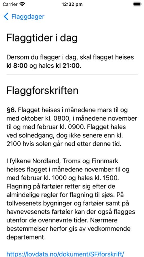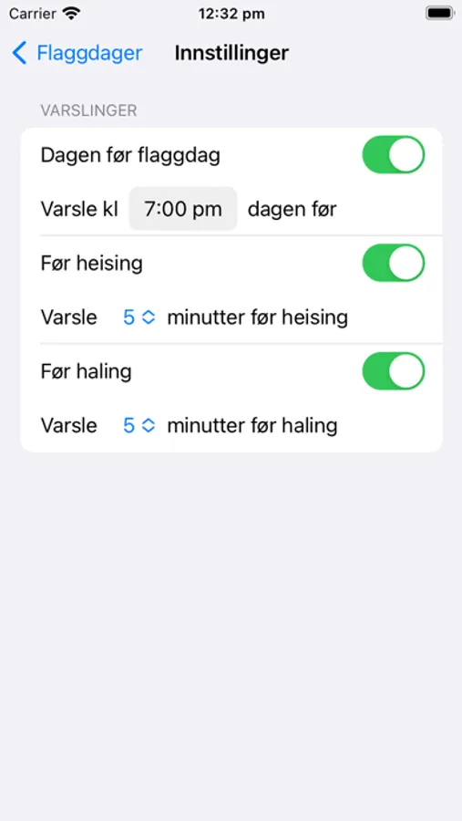 Tidspunktene for heising og haling følger norske flaggregler, og regnes ut nøyaktig basert på din posisjon og tidspunktene for soloppgang og solnedgang. Du kan selv velge når du vil bli varslet.