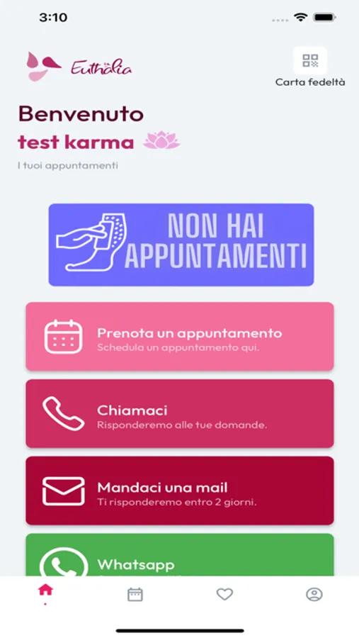 Nell'app di centro estetico euthalia potrai gestire i tuoi appuntamenti nel nostro centro. Vedere in diretta se il tuo appuntamento è stato confermato e anche annullarlo. In più potrai ricevere informazioni sul listino e su dove ci troviamo.