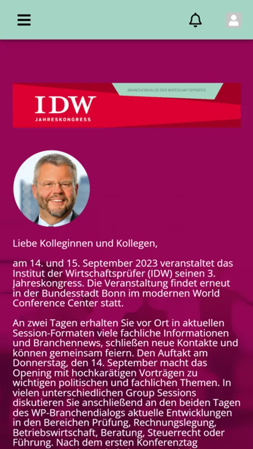 IDW Jahreskongress, Branchentreff der Wirtschaftsprüfer, Networking - Informationen - News aus der Branche. Der Jahreskongress ist ein zentraler Baustein für den Erfahrungsaustausch unter den Mitgliedern. Es erwarten Sie zwei Tage Wissensvermittlung, interessante Vorträge, bereichernde Dialoge mit Kolleginnen und Kollegen und natürlich ein spannender Event-Abend. Wir bieten über 35 verschieden Themen rund um das Thema Wirtschaftsprüfung an. Aktuelles Wissen rund um die Themen Prüfung, Rechnungslegung, Betriebswirtschaft, Beratung, Steuerrecht und Führungskompetenz. In der Fachausstellung informieren wir Sie über neue digitale Lösungen, Publikationen, Versicherungs- und Vorsorgeprodukte sowie Marketinglösungen.