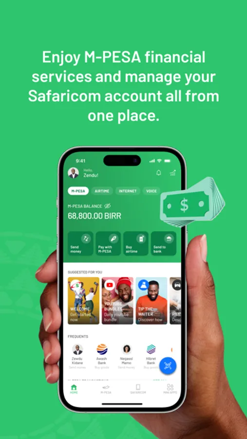 Introducing the new M-PESA Safaricom App! Enjoy safe, easy, and convenient financial and communication services all in one app. Send money, pay merchants and bills, pay for fuel, buy airtime and bundles, check airtime usage, and withdraw money with just a few taps on your mobile phone. With the new and simplified user experience, you can manage your finances effortlessly. Plus, you can track your spends, and authenticate transactions with biometrics. Simplify your life and download the M-PESA Safaricom App today.