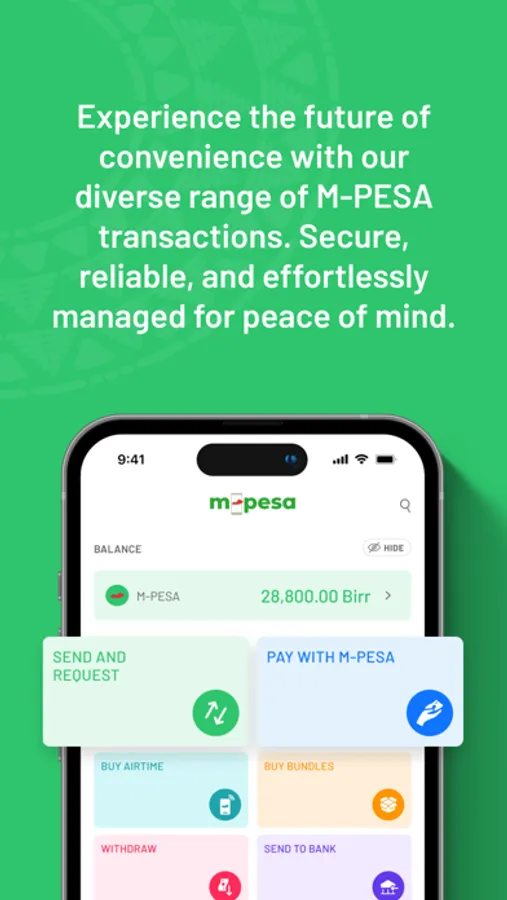 • M-PESA transactions - Access all core M-PESA transactions with a simplified experience - Send money, pay merchants, bills and fuel with M-PESA, withdraw at agent or ATM and buy airtime.