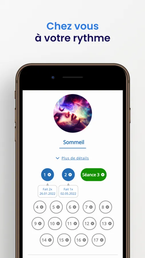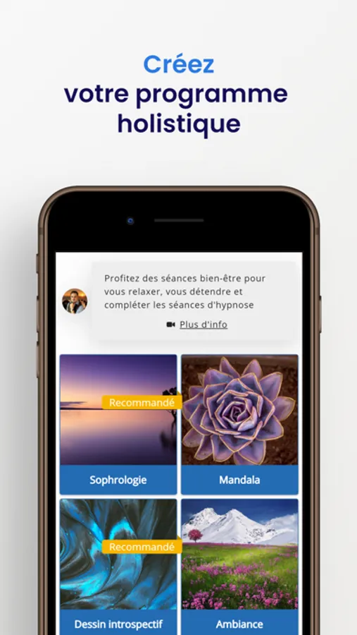 - Profitez de 15 programmes personnalisés différents : Sommeil, Mieux dormir, phobie, mincir, tabac, anxiété, stress, abandon, burnout, confiance en soi, douleurs psychosomatiques, peur de l’échec, frustration.