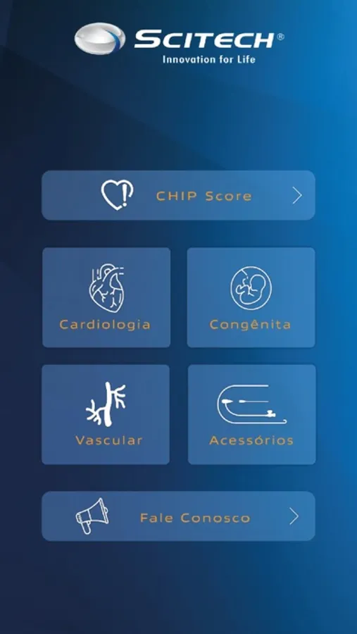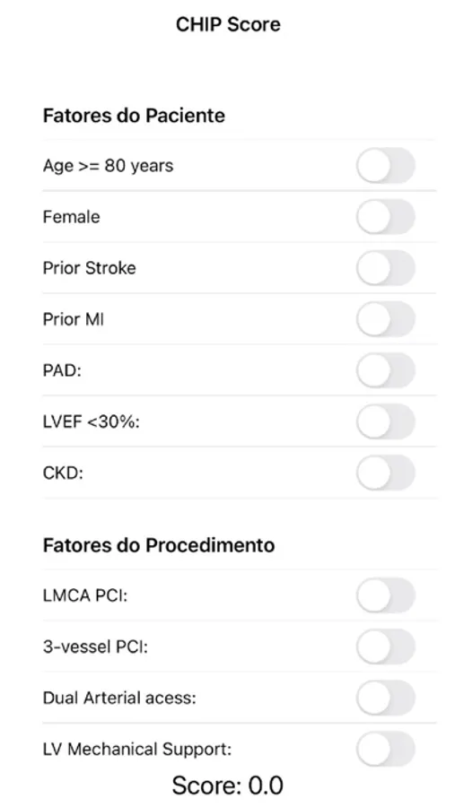 Aplicativo para o Cálculo do Chip Score de acordo com os fatores de risco do Paciente e do procedimento como base no Estudo publicado no Jacc jornauls. Informações da empresa Scitech produtos médicos industria brasileira.