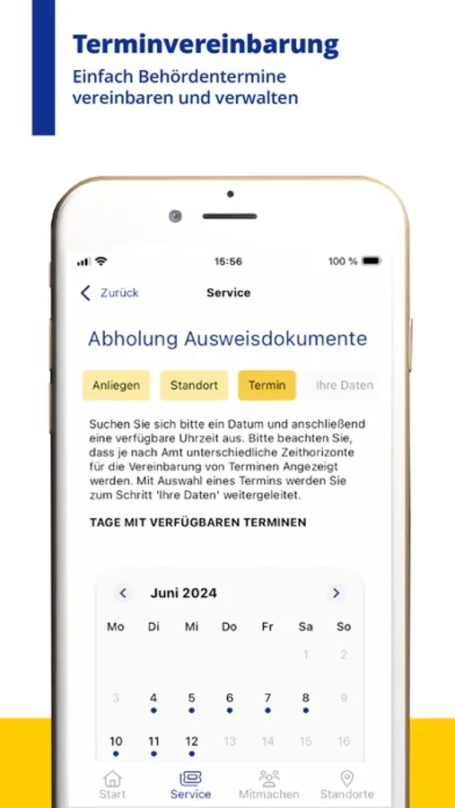 • Termine bei Ämtern buchen: Buchen und verwalten Sie Termine direkt in der App, um zum Beispiel Ausweise, Meldebescheinigungen und mehr zu beantragen