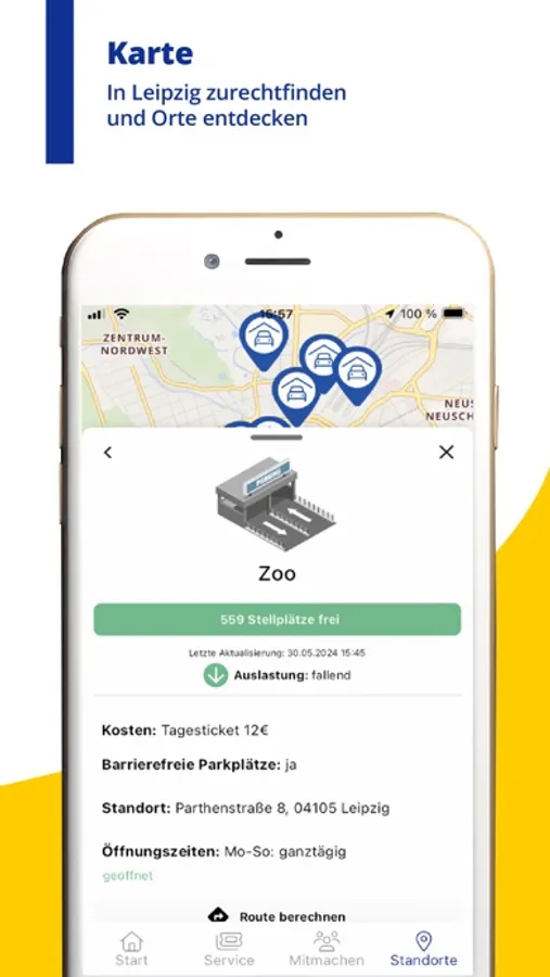 • Umfangreiche Stadtkarte: Finden Sie freie Parkplätze in Parkhäusern, öffentliche Toiletten, WLAN-Hotspots, Wertstoffhöfe oder Altglascontainer, Museen und vieles mehr