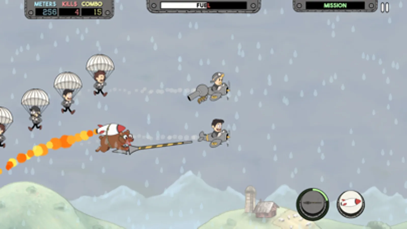 Soar through the skies as a rocket-powered bear and unleash chaos. Ram enemy planes, roast pilots mid-air with your jet flames, or unleash a mighty roar to scare enemy pilots straight out of their cockpits, sending their planes crashing into each other in chaotic, cartoonish fashion.