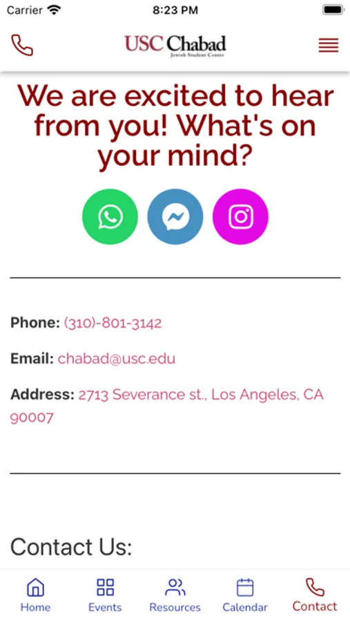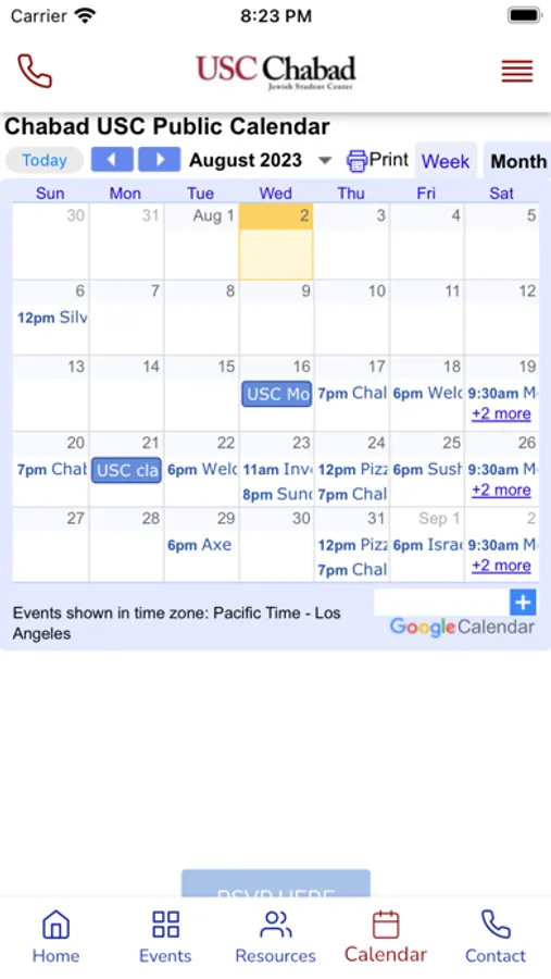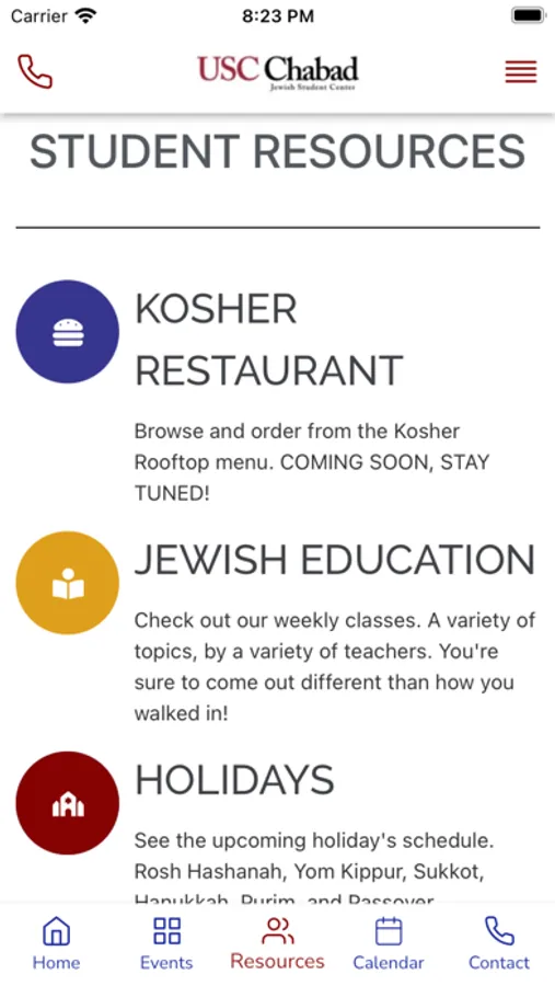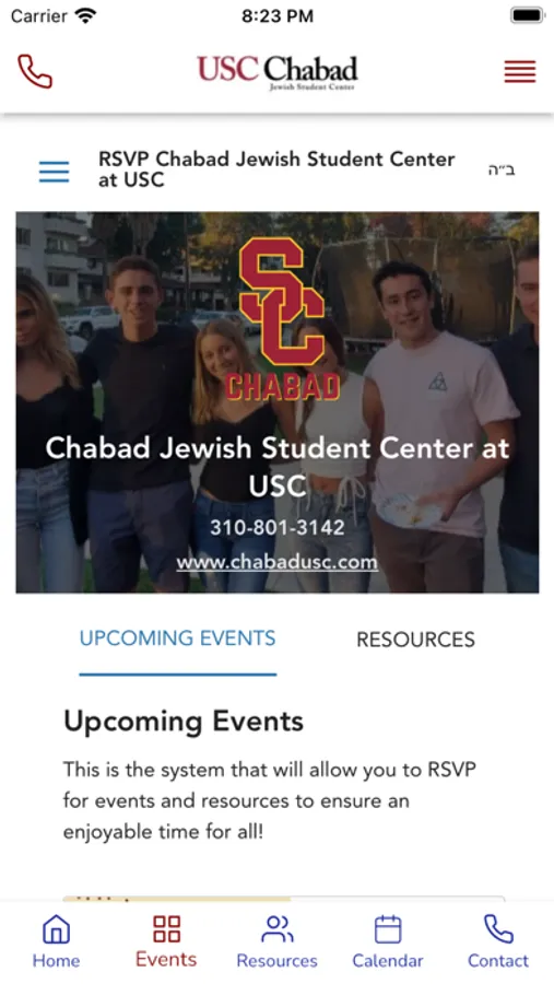 An app to assist students at USC to access the resources provided by Chabad Jewish Student Center. It includes the website, the events calendar, an RSVP system, a kosher restaurant menu, as well as many other pages and resources.