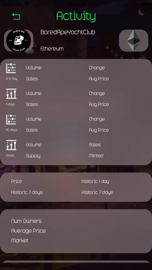 * Activity including valume, sales, supply, price changes, historic data, number of owners, average price and market price
