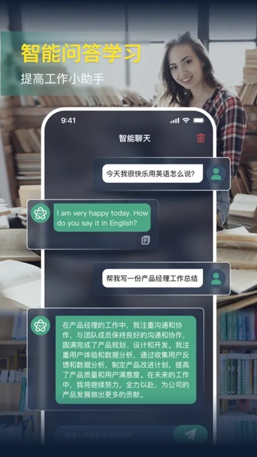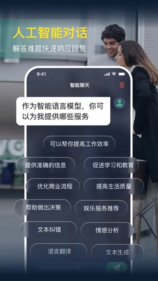 与机器人对话能够理解您的问题,根据上下文,并以自然语言进行智能回答,帮助您获得准确的信息和解决方案。以及代码编程,合同起草等多种功能帮助您解决各种问题。