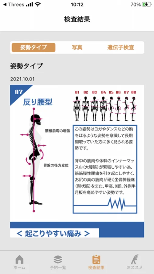 お客様の「姿勢タイプ」、「遺伝子検索」の結果が閲覧できます。