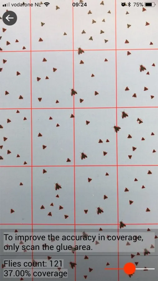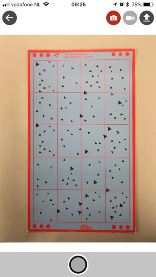 With help of our intelligent software, we scan glue boards in an automated process. This is done by analyzing a photo, taken from a scannable glue board. From the photo taken, the app calculates the flies and the % of board coverage and will inform you of the results. If you take a straight photo of the board, these results are up to 90%-95% accurate.