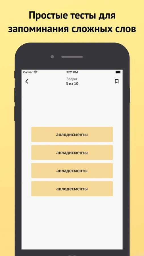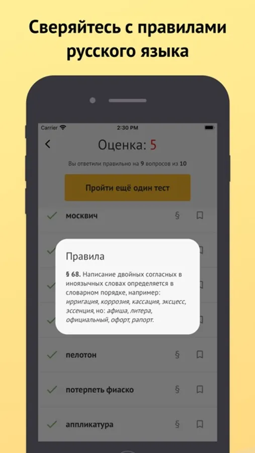 Приложение предназначено для всех, кто хочет улучшить свою грамотность и обогатить словарный запас. Проверка орфографии при помощи простых тестов поможет запомнить правила правописания сложных слов русского языка, в которых часто делают ошибки.