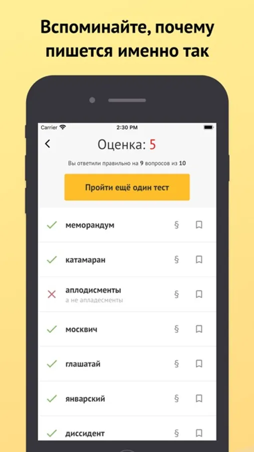 Есть быстрый доступ ко всем пройденным словам — всегда можно освежить в памяти правила русского языка и значение слова.