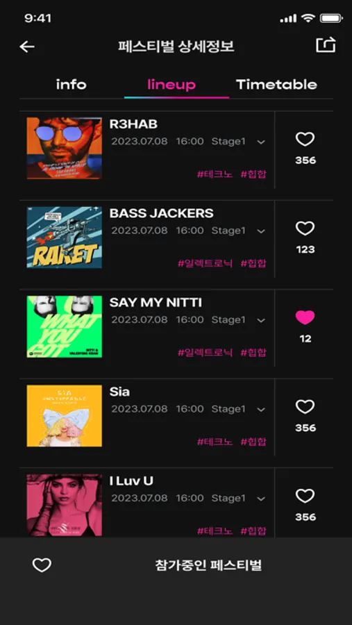 - 행사장 맵 및 부대시설 정보, 아티스트 라인업, 타임테이블 스케줄을 개인화하여 관리할 수 있습니다.