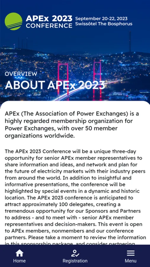 Welcome to the official APEx 2023 Conference App, your essential guide to the Association of Power Exchanges Conference from Sept 20-22. Access real-time updates on conference schedules, speaker info, and venue details at Swissotel, Istanbul. Navigate effortlessly through the sessions and plan your participation with ease. The app offers a simple and efficient way to stay informed and get the most out of the conference. Download now and enhance your APEx 2023 experience!