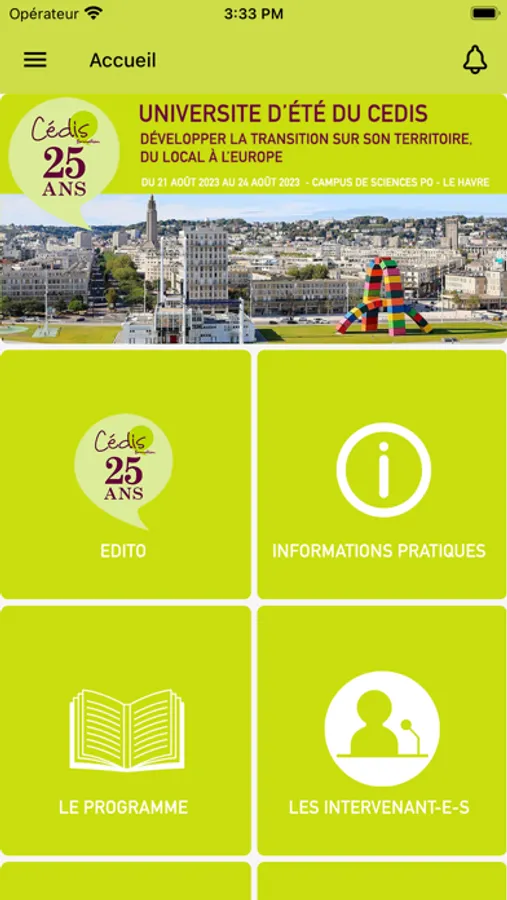 Comme chaque année, le Cédis organise son Université d’été de formation : quatre jours pour permettre aux élu-es de toutes collectivités et à leurs collaborateurs de s’informer, de se former et d’échanger sur l’exercice de leur mandat. En 2023, le Cédis s’installera du lundi 21 (après-midi) au jeudi 24 août (midi) sur le campus de SciencesPo Le Havre. Objectifs généraux Renforcer ses connaissances sur les politiques publiques locales Alimenter sa réflexion avec des retours d’expériences Découvrir de nouveaux outils et méthodes de travail