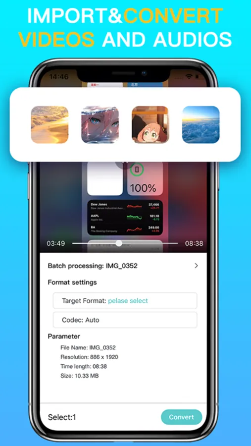 • Video converter: convert to3g2, 3gp, avi, flv, mkv, mov, mp4, mpeg-1, mpeg-2, mpg, ogg, webm, wmv, iPad, iPhone, iPod.