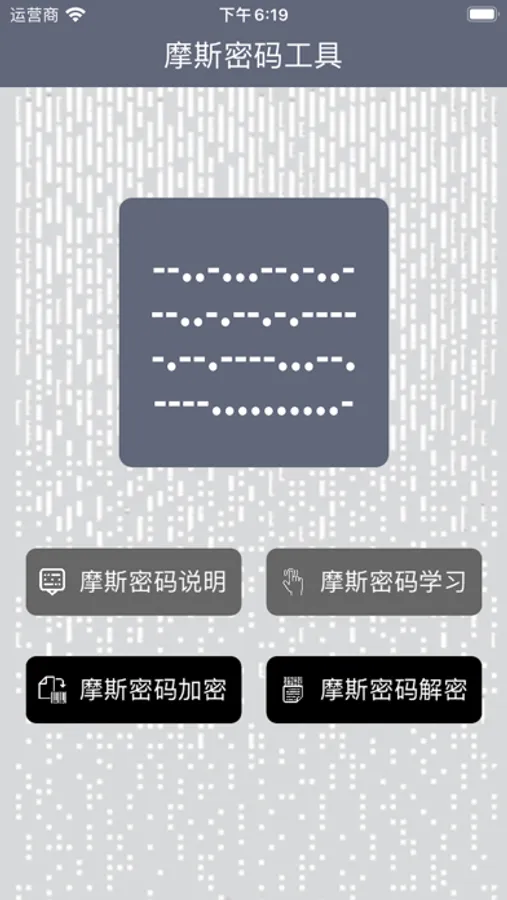 摩斯密码加密、解密工具可以把文字转换为摩斯密码,也可以把摩斯密码还原为文字,支持中文、英文等文字。在文字输入框中输入文本,单击'摩斯密码加密'按钮,将文本翻译为摩斯密码。在摩斯密码输入框输入摩斯密码,单击'摩斯密码解密'按钮,即可以将摩斯密码翻译为文字。使用摩斯密码工具,可以实现摩斯密码的在线翻译,隐秘传递一些敏感信息。