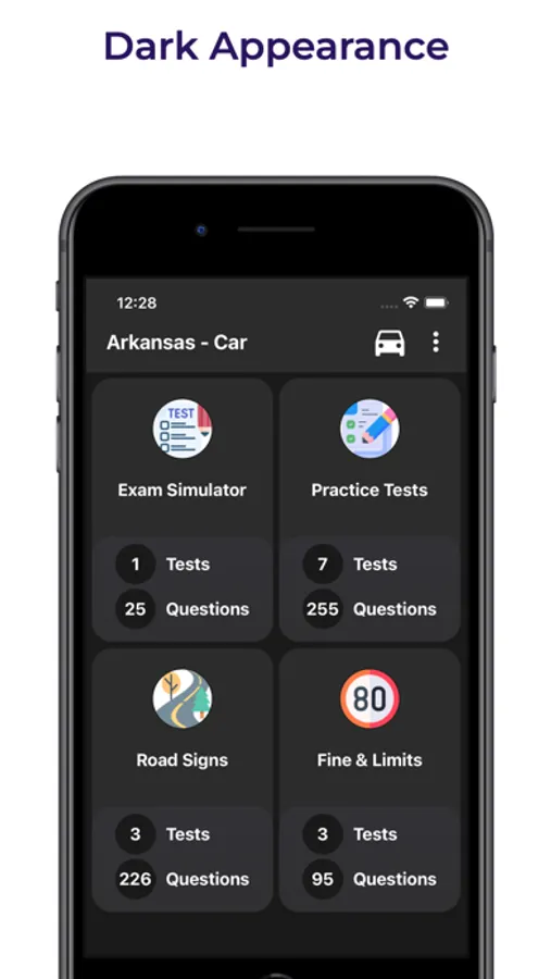 The app includes a Mock Test with random questions and a Practice Test with a variety of DMV Permit Test practice questions. These questions are based on the Arkansas Department of Motor Vehicles handbook.