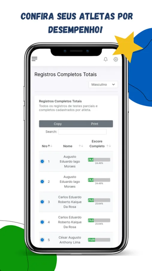 Se você é treinador, facilite seu trabalho cadastrando seus atletas e inserindo dados de testes físicos. Com apenas alguns cliques, visualize o progresso de cada um por meio de indicadores práticos, derivados de análises estatísticas avançadas. O destaque fica para o Escore Físico, que classifica o desempenho de todos os atletas, mostrando quem está brilhando mais!