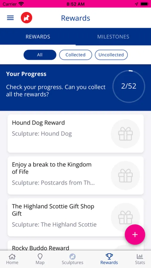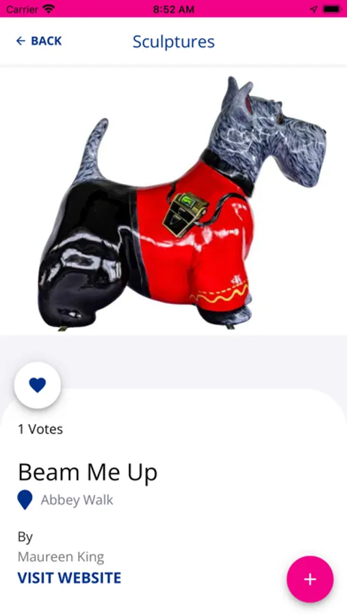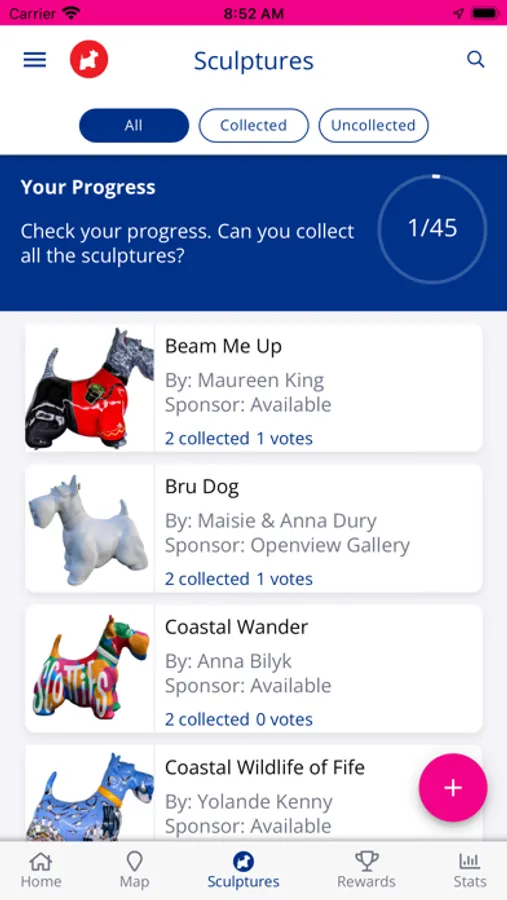 Art trail app includes: map, sculpture listings, design inspiration, sculpture and milestone rewards, sculpture galleries, voting, trail stats, social sharing and event listings.