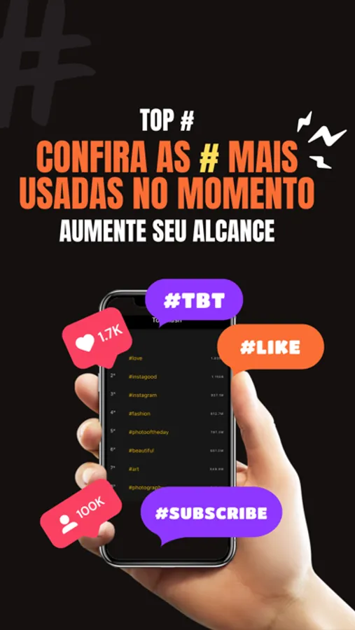 Com uma interface amigável e intuitiva, nosso aplicativo permite que você navegue facilmente entre diferentes categorias de hashtags, abrangendo uma ampla gama de tópicos.