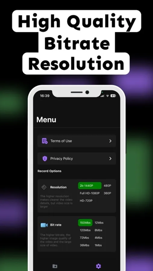 Varied Configurations: Adjust resolution, frame rate, and bit rate to suit your recording needs. Whether it's high-intensity gaming or a casual app walkthrough, Screen Recorder+Face Cam has got you covered.