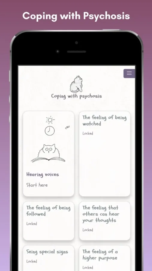 This app offers a gamified way to learn mental coping mechanisms for psychotic experiences. You will play a cat called Whiskers who suffers from paranoid schizophrenia. She will hear voices and have dellusions. You have to decide which thinking approaches will help her the most. In this way you will be able to experiment with different beliefs and learn about psychotic experiences. This approach is based on the cognitive behavioral therapy for psychosis. It includes normalising and cognitive restructuring.