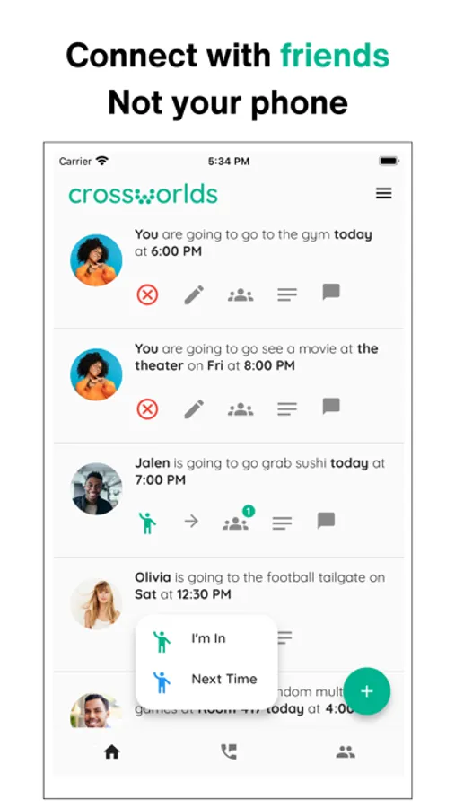 With Crossworlds, you can send quick, casual invites to the people in your life, commitment-free. Need a partner for your afternoon hike? Or someone to catch that new movie with? Send out an open invite or accept one from a friend!