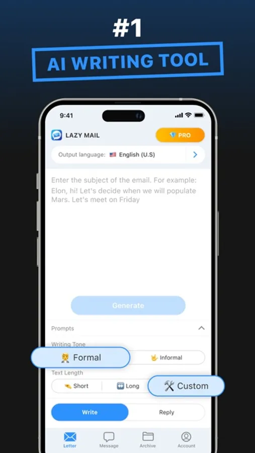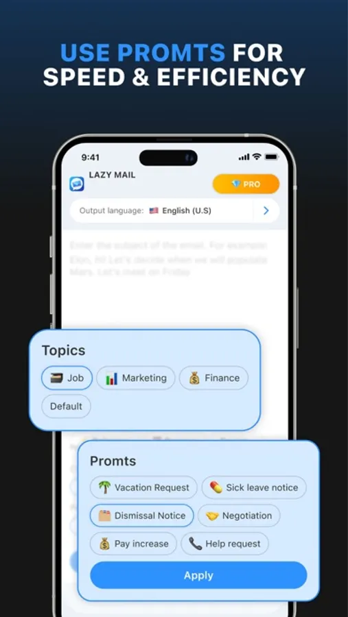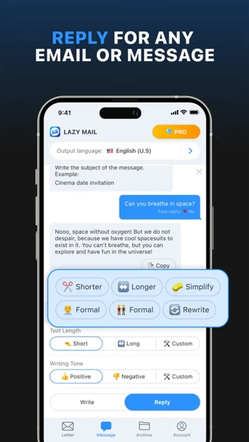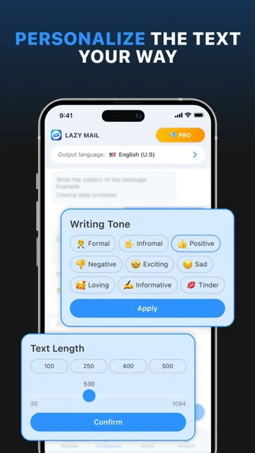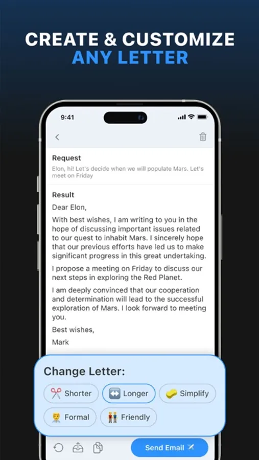 Lazy Mail enhances your writing with personalized suggestions, customizable tone of voice, and desired text length. You can compose a 1000-symbol letter using just one sentence on any topic you choose. With pre-made prompts, it becomes even more efficient. Just select the relevant prompt, add the recipient's name, and voila! Your letter is ready.