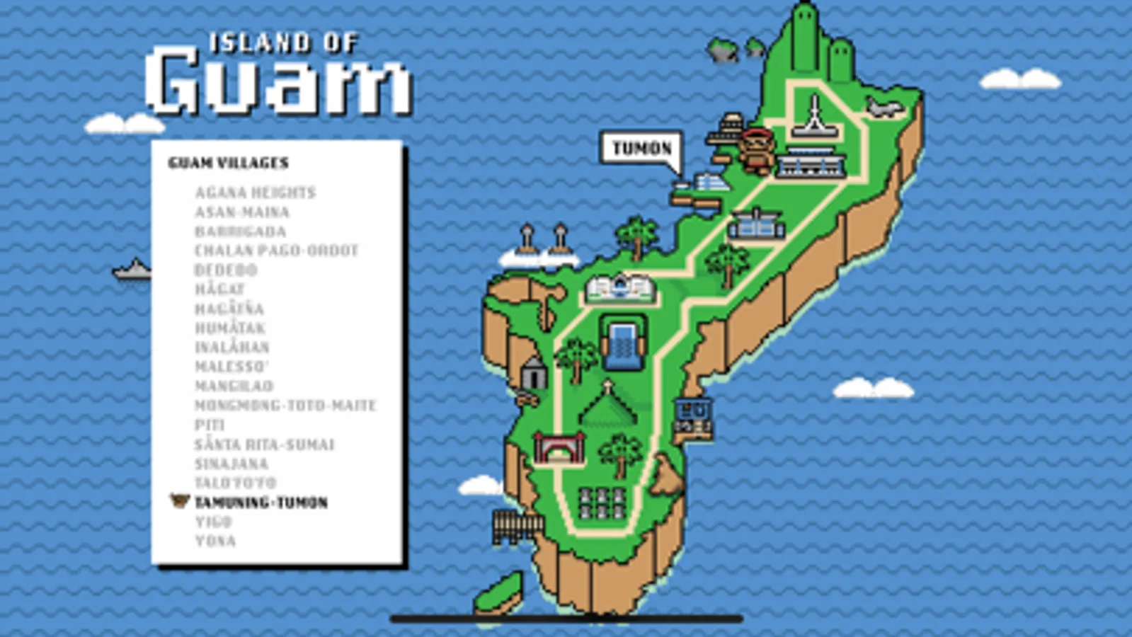 Welcome to the Island of Guam, a land filled with wonder and adventure! Embark on an unforgettable journey with Pario, a brave hero inspired by the classic 8-bit games we all adore. Follow Pario as he sets out to explore all 19 villages on the island, each with its unique charm and breathtaking scenery.