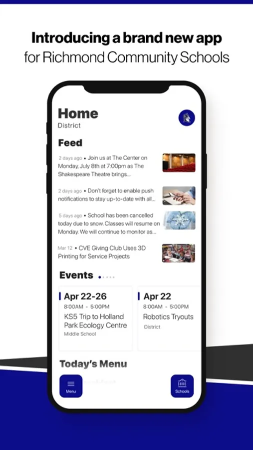 The event section shows a list of events throughout the district. Users can add an event to their calendar to share the event with friends and family with one tap.