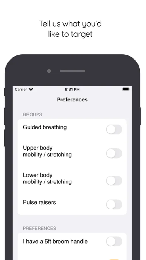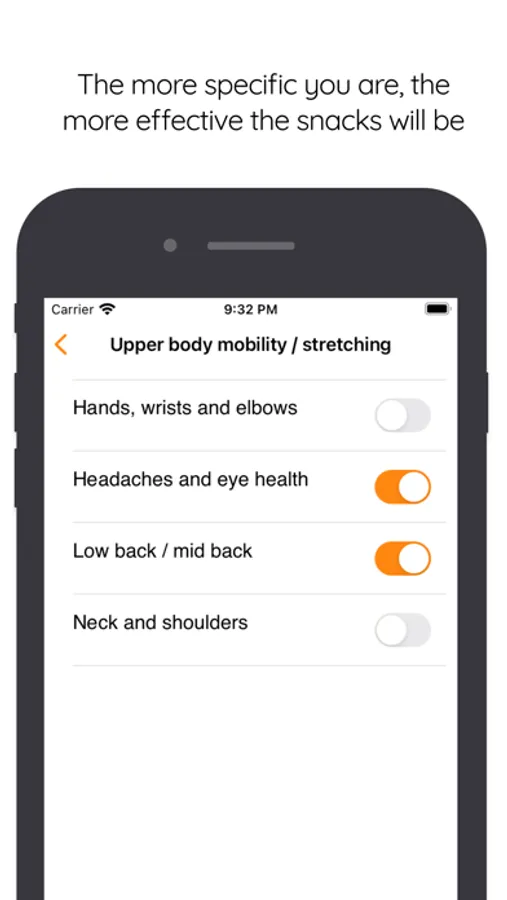 To use the app most effectively, be specific with your preferences. If there are 40, say, movement snacks in your pool but you only want one per day, although the movements might be fun and invigorating they won't really help any specific issues you may have. We suggest you pick one outcome (such as lengthening hamstrings, loosening low back, increase energy and blood flow) then do 3-4 movement snacks per day for 3-4 weeks, before picking a different outcome. We suggest you invest in a 5ft broom handle and keep it next to your desk, facilitating a number of extra high-value movement snacks.