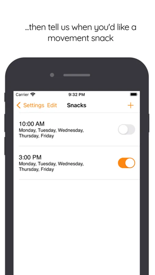 We suggest you only set your notifications for times when you're at your desk and usually at a suitable stopping point, such as before your Monday morning meeting or before lunch. One movement snack per day is better than none. But you'll feel and notice the benefits (better movement, less tightness and stiffness, better mental focus) if you consistently indulge in three to four on every work day.