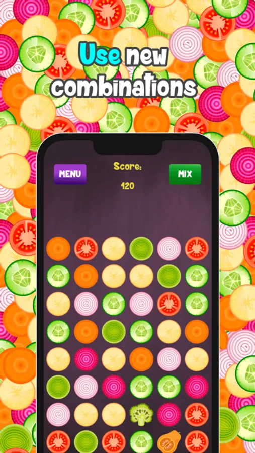 Connect fruits and vegetables to get lines that will bring you a lot of points.