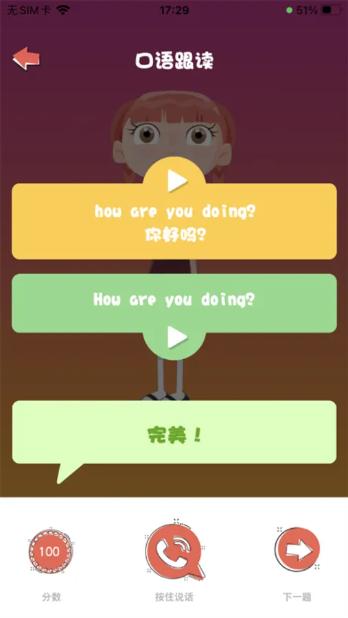 App内置AI英语聊天机器人,只需要通过语音或文字与其对话聊天,这个英语伙伴就可以进行流畅的英文回答,帮助小朋友练习生词和口语。