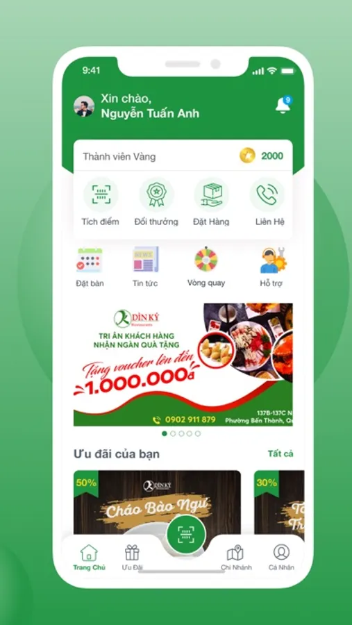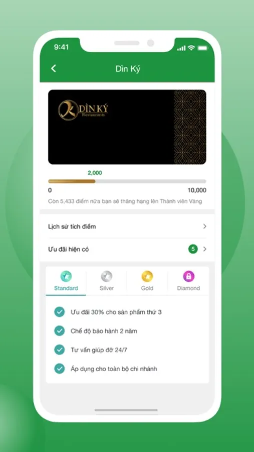 - Tích Lũy Điểm Thưởng dành cho quý khách hàng thân thiết của nhà hàng Dìn Ký có thể đổi điểm trực tiếp từ ứng dụng và theo dõi số điểm tích lũy của mình.