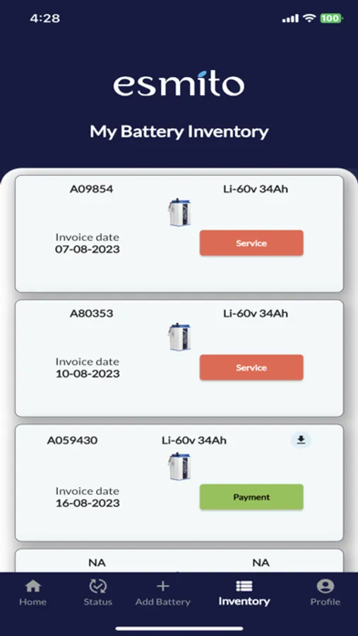 But that's not all! Esmito Battery App goes beyond the basics, empowering you to schedule battery service requests, effortlessly track service history, and efficiently manage your battery inventory.