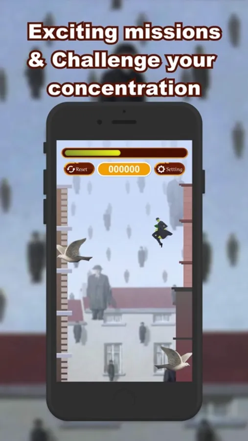 In the city of Golconda, countless black-clad individuals descend from the sky like rain, and you become one of them. You must continuously jump and move. However, this city is far from peaceful, and you must be careful to avoid the obstacles that appear in the city.