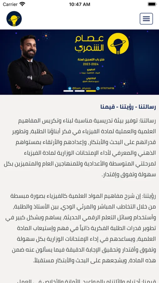 رسالتنا: توفير بيئة تدريسية مناسبة لبناء وتكريس المفاهيم العلمية والعملية لمادة الفيزياء في فكر أبناؤنا الطلبة، وتطوير قدراتهم على البحث والابتكار، وإعدادهم والارتقاء بمستواهم الذهني والمعرفي لاداء الإمتحانات الوزارية لمادة الفيزياء لمرحلتي المتوسطة والأعدادية وللمنهاجين العام والمتميزين بكل سهولة وتفوق وإقتدار