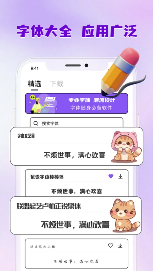 您的手机、平板必备的字体大全工具,可以安装上百款手机字体,免费下载、免费导出、免费安装,花样字体随心挑选,让你的手机不再单调!