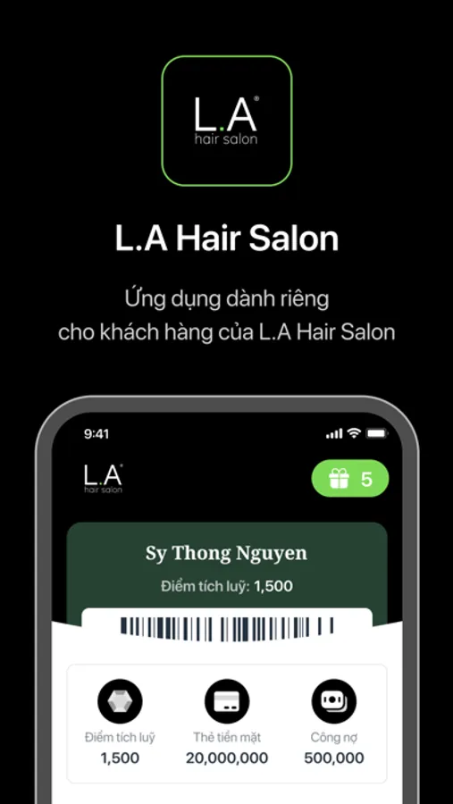 L.A HAIR SALON là Ứng dụng dành cho khách hàng của L.A Hair Salon. Ứng dụng giúp khách hàng thuận tiện đặt lịch làm dịch vụ và theo dõi lịch hẹn, theo dõi các thông tin liên quan đến thẻ tiền mặt, điểm tích luỹ, lịch sử hoá đơn, gói dịch vụ đã mua