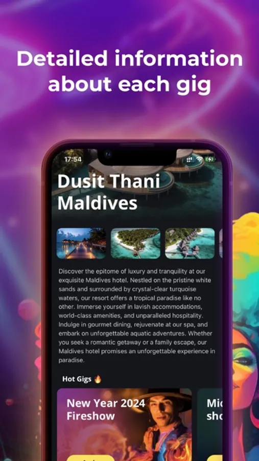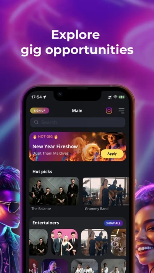 This is a gallery app with a list of entertainers and venues. You can see what gigs are out there